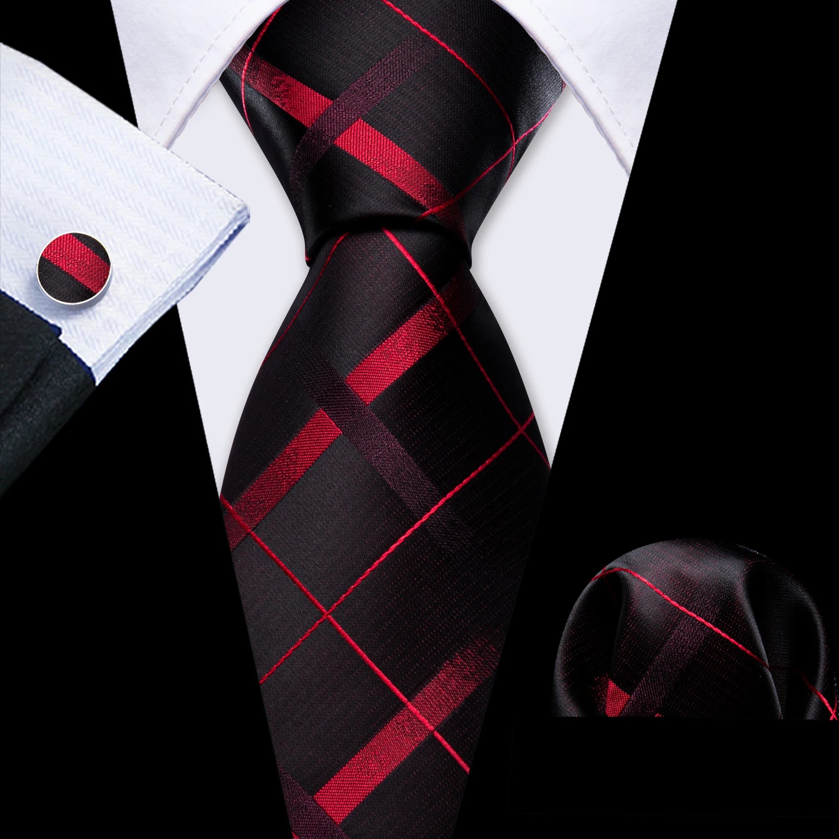 Conjunto de Gravata Masculina de Seda Xadrez Vermelha Barry Wang