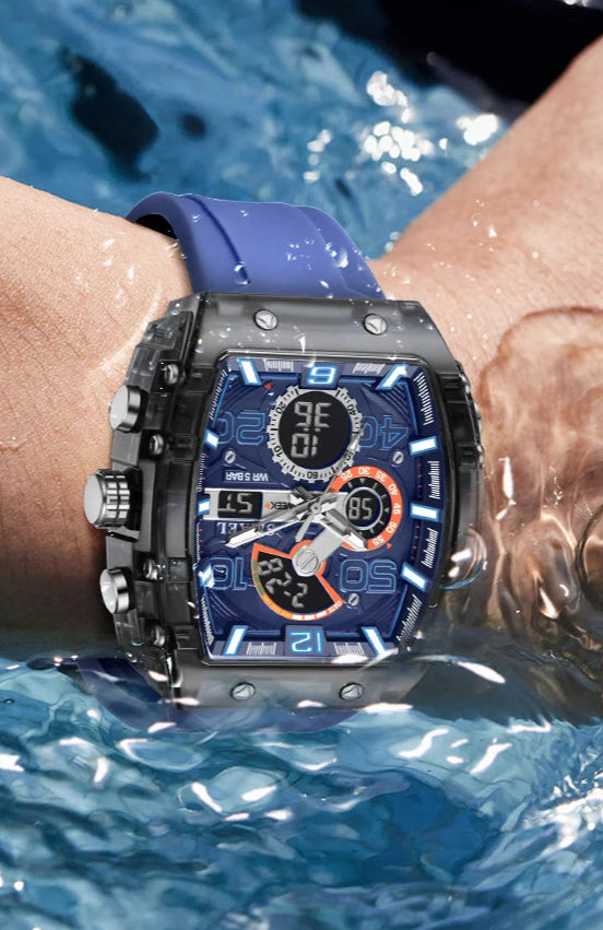 O Titan Core X une design quadrado futurista com display duplo analógico + digital e funções de sobrevivência urbana: cronógrafo, alarme, calendário completo, iluminação noturna e resistência à água de até 50 metros. Um tanque de pulso pronto para qualquer missão.